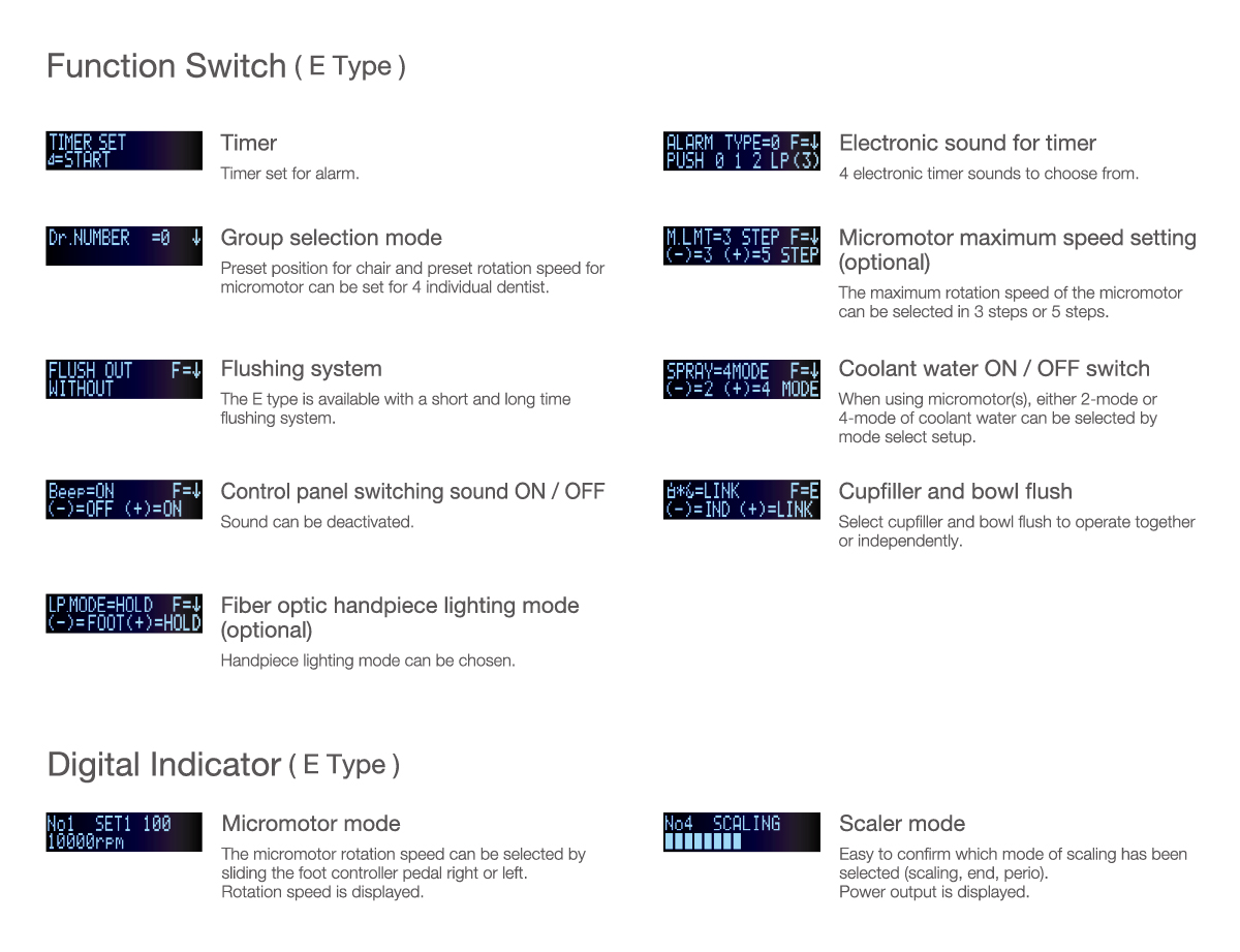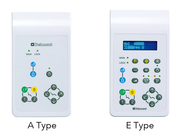 A2(control of air instruments, water on/off and chip air) for A type. SE(control of air instruments, water on/off, chip air and control of electric motor/scaler) for E type. Foot controller with handle is available as an option.