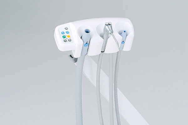 Switches for chair control, cupfiller, and bowl flush are conveniently located next to the handpieces, instead of out of the way on the cuspidor.